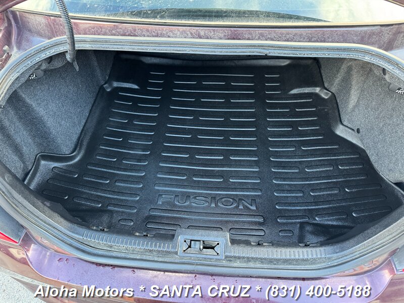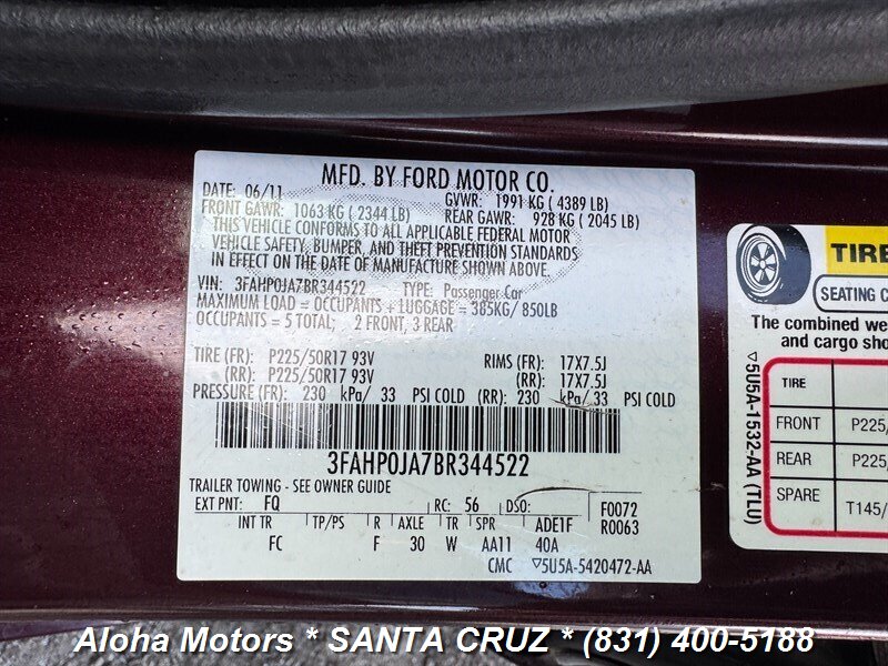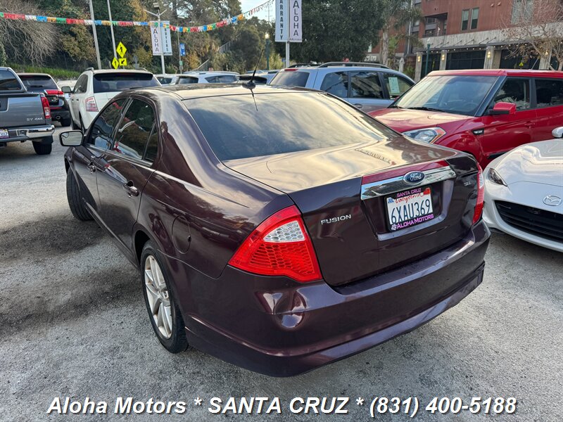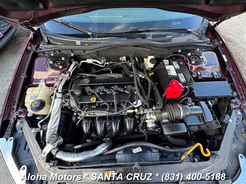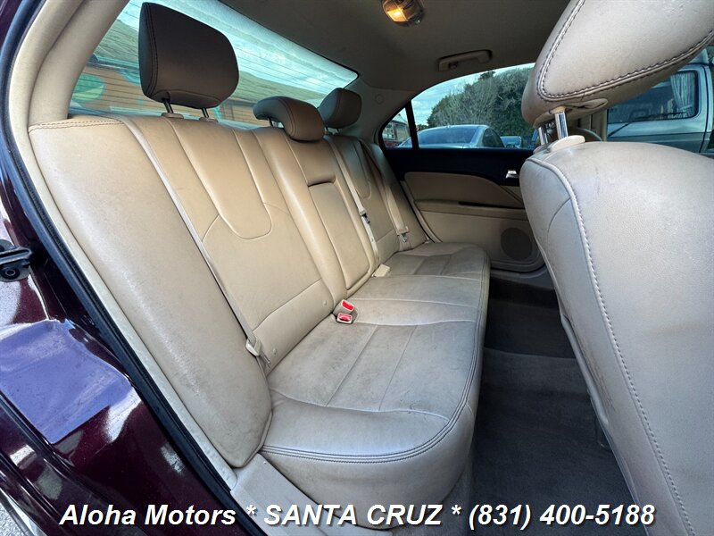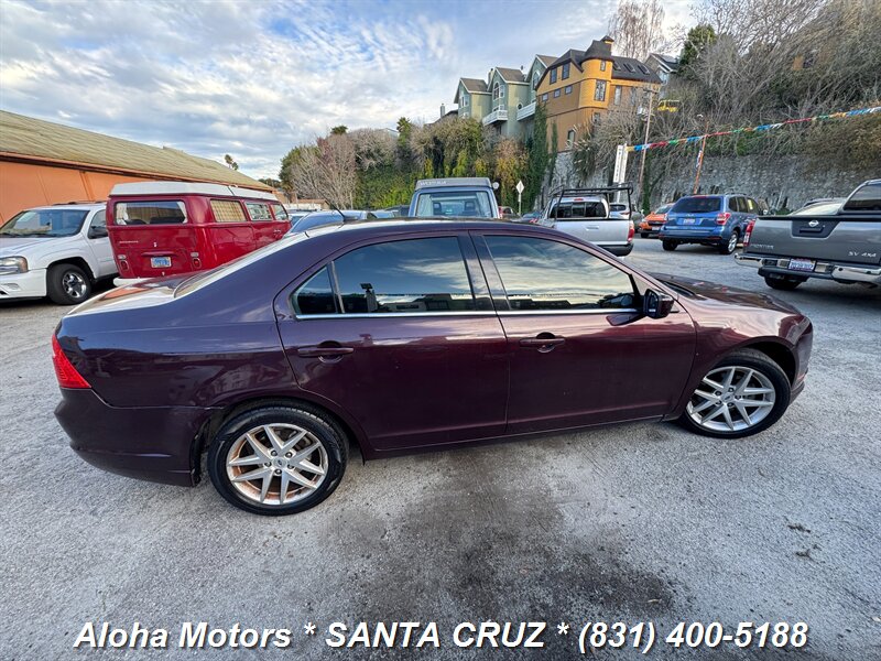 2011 Ford Fusion SEL — powered by a 2.5L I4 producing 175 hp and 172 lb-ft, finished in Bordeaux Reserve Metallic Red with a Camel interior. This well-kept example has under 129,000 miles (averaging less than 9,000 miles per year), returns an EPA-estimated 23 MPG city / 33 MPG highway, and shows a clean CARFAX. Factory SEL equipment typically includes leather-trimmed seating surfaces with a power-adjustable driver’s seat, 60/40 split-folding rear seat, dual-zone automatic climate control, steering-wheel-mounted audio and cruise controls, power windows and locks with remote keyless entry, AM/FM/CD audio with auxiliary input and Bluetooth hands-free, 17-inch alloy wheels, fog lamps and chrome exterior accents. Safety and convenience features from the factory include anti-lock brakes (ABS), electronic stability and traction control, front and side-impact airbags with side-curtain protection, tire pressure monitoring and an anti-theft system.