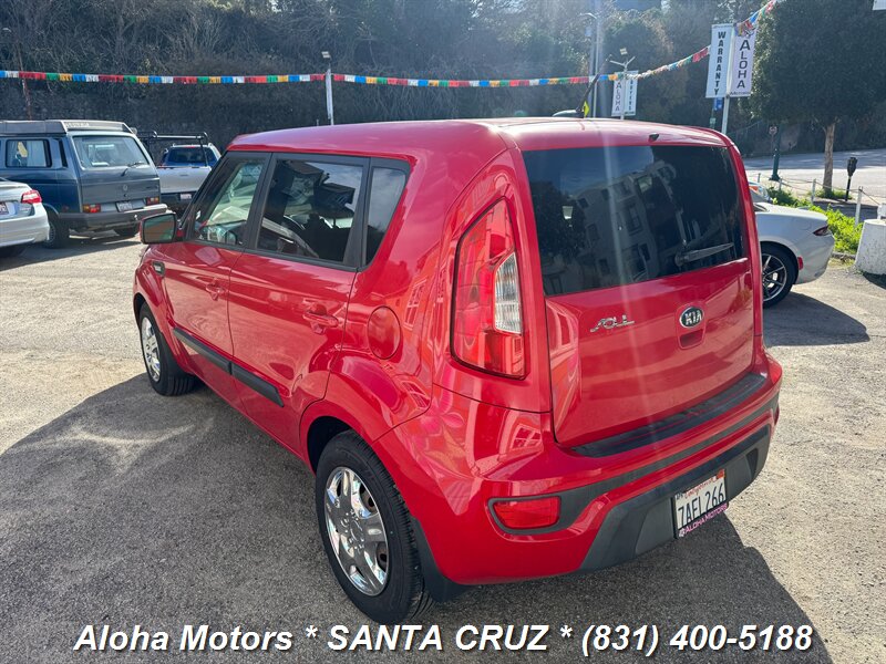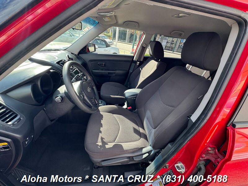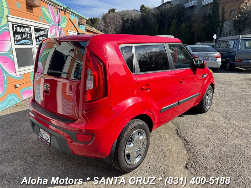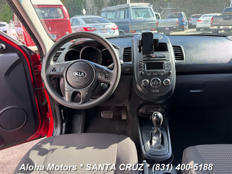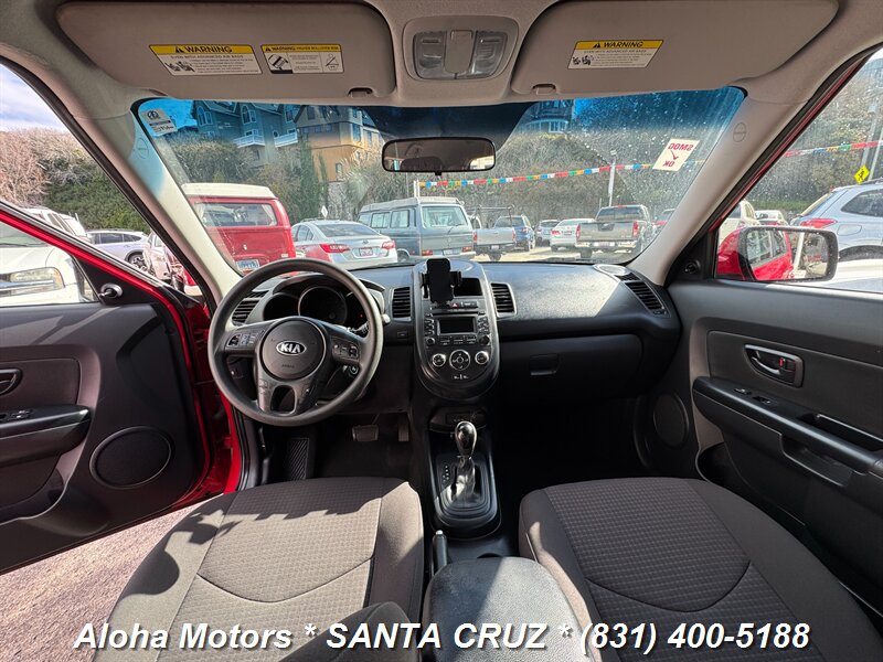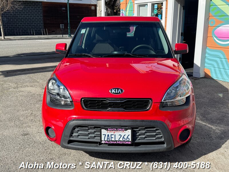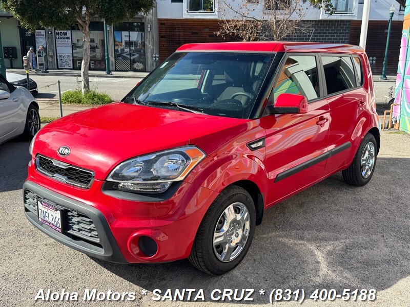 2013 Kia Soul powered by a 1.6L I4 producing 138 hp and 123 ft.-lbs. of torque, finished in Molten with a Black interior. Well-maintained with under 129,000 miles (averaging <10,000 miles/year), a clean CARFAX and one owner; EPA-rated 25 MPG city / 30 MPG highway. Factory-standard equipment includes air conditioning, cloth upholstery, 60/40 split-folding rear seats, AM/FM/MP3 audio with auxiliary and USB inputs, Bluetooth hands-free calling and steering-wheel audio controls, power windows and locks with remote keyless entry, cruise control and tilt steering, full power accessories, plus safety systems such as ABS, electronic stability and traction control, front and side airbags with side curtain protection, and tire pressure monitoring.